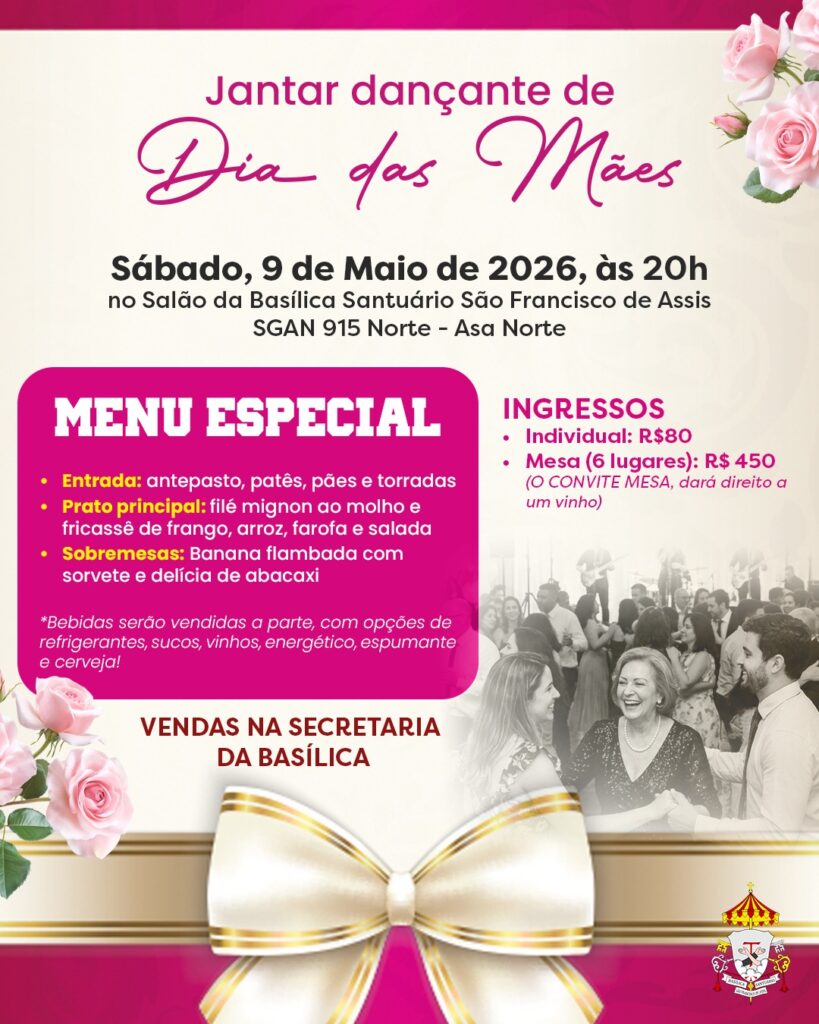 A Basílica Santuário São Francisco de Assis, em Brasília, promove no próximo dia 9 de maio, às 20h, o Jantar Dançante de Dia das Mães, uma noite pensada para celebrar essa data tão especial em clima de alegria, convivência e gratidão. Em 2026, a paróquia completa 45 anos, e o evento também marca o resgate […]
